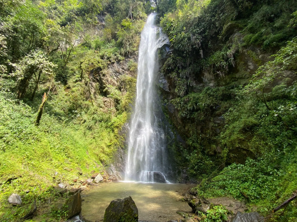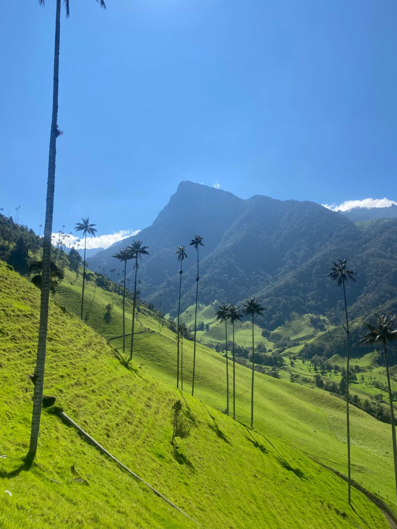 Pünktlich um halb acht stehe ich heute auf dem Plaza de Bolívar und verlasse wenig später mit einem der ersten Jeeps des Tages den Ort. Zwanzig Minuten dauert die Fahrt zum „Valle de Cocora“. Als wir ankommen, herrscht dort bereits großer Trubel, dutzende Busse mit Touristengruppen stehen auf dem Parkplatz. Doch die Masse an Besuchern verteilt sich hinter dem Kassenhäuschen auf den verschiedenen Wanderwegen. Drei Stunden lang wandere ich durch die grüne Hügellandschaft mit ihren Palmen. Die „Quíndio-Wachspalmen“ sind für die Region einzigartig und zählen mit bis zu 60 Metern Höhe als die am höchsten wachsende Palmenart der Welt. Gegen Mittag steige ich wieder in einen der Shuttle-Jeeps, fahre allerdings nicht bis nach Salento, sondern lasse mich nach wenigen Kilometern mitten im Nirgendwo absetzen. Auf dem Hinweg hatte ich dort einen Wasserfall gesehen, zu dem ich nun hinzugelangen versuchen wollte. Nach einer Stunde Wanderung über Kuhwiesen und matschige Trampelpfade erreiche ich tatsächlich die wunderschöne Kaskade, die sich in einen kleinen Pool ergießt. Anders als im „Valle de Cocora“ bin ich hier komplett allein und so kann ich eine Runde im Wasserfall duschen gehen, bevor ich mich auf den Rückweg mache.