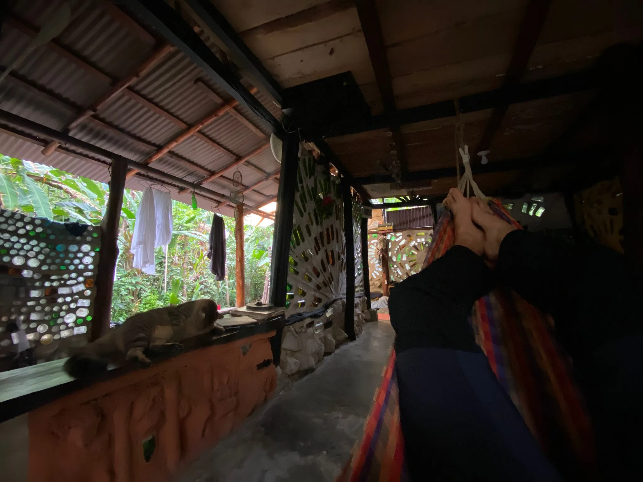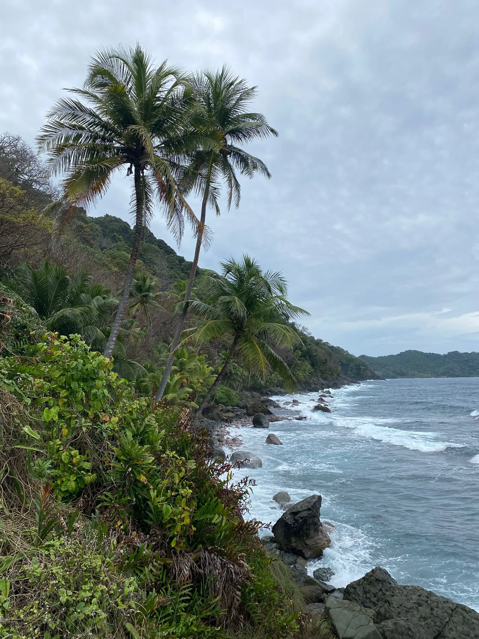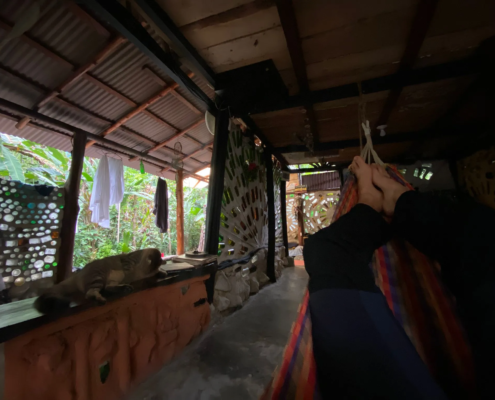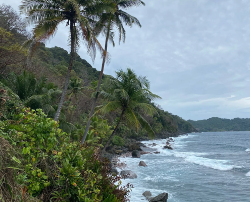Als ich am Morgen aufwache, fühle ich mich schon deutlich besser. Gut genug, um an meinem Blog zu schreiben – dazu hatte mir die vergangenen Tage die Kraft gefehlt. Nachdem der Post fertig getippt ist, kommt zum ersten Mal, seit ich in Capurganá angekommen war, dann auch die Sonne heraus – zumindest ein klein wenig! Motiviert schnall ich mir meine Sandalen an die Füße und spaziere den an der Küste entlangführenden Weg, den wir gestern Abend zum Playa Verde gegangen waren, entlang. Diesmal ende ich jedoch nicht an dem Strand, sondern folge einem schmalen Trampelpfad weiter am Wasser entlang. Hohe Kokospalmen ragen aus dem dichten grünen Dschungel, schäumende Wellen preschen auf die Felsen am Ufer. Am Ende des unwegsamen Trails befinden sich einige natürliche Felspools mit Blick auf das Meer – ein beliebter Instagram-Spot. Je weiter der Tag voranschreitet, desto stärker werden auch wieder meine Kopfschmerzen und so verbringe ich einen großen Teil des Nachmittags wieder in der Hängematte liegend, vegetiere in der feucht-tropischen Hitze vor mich hin, trinke literweise Wasser und ernähre mich größtenteils von Bananen.