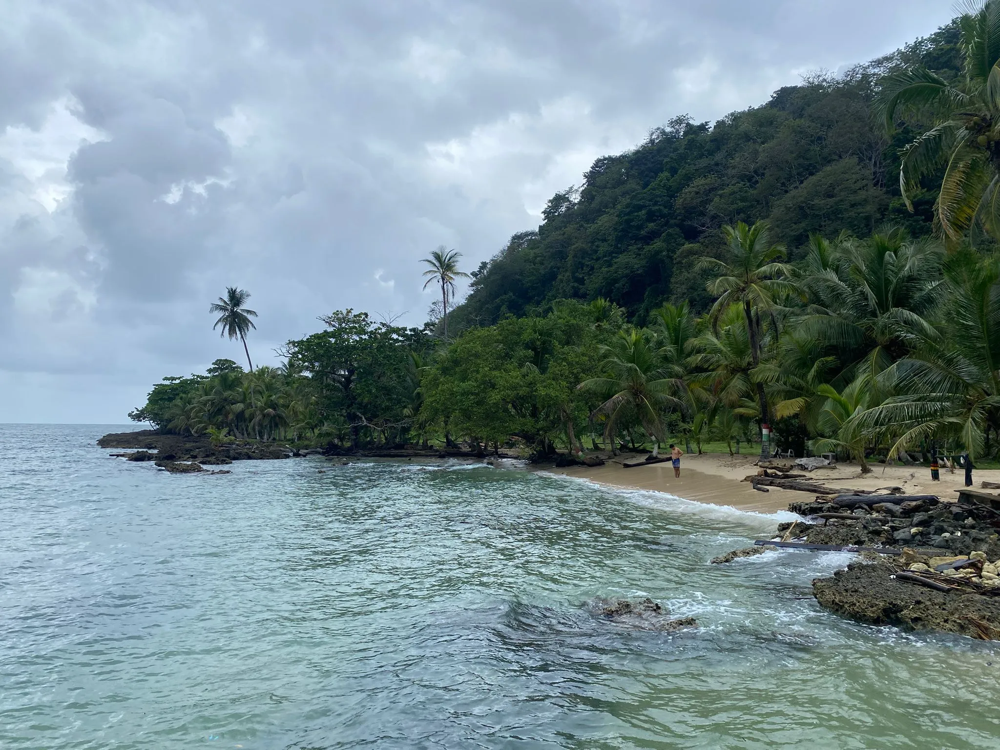 Mein letzter voller Tag in Capurganá brach an – wenn ich La Miel, eine der Hauptattraktionen des Ortes, noch besuchen wollte, dann heute! Bei La Miel handelt es sich um einen abgelegenen, malerischen Strand, der für sein kristallklares türkisfarbenes Wasser und strahlend weißen Sand bekannt ist. Zwei Stunden Wanderung von Capurganá entfernt liegt der Strand dabei genau genommen schon in Panama, doch an der Grenze kontrolliert niemand. Ich hatte mir extra einen Wecker gestellt, um möglichst noch vor der drückenden Mittagshitze zurück zu sein. Der vier Kilometer lange Trail führt quer durch den Dschungel und hat deutlich unter dem vielen Regen der letzten Wochen gelitten. Bereits nach wenigen Metern sind meine gesamten Beine in braunen Schlamm getüncht – ich rutsche mehr, als dass ich gehe. Verschwitzt erreiche ich nach anderthalb Stunden den kleinen Ort Sapzurro und werde dort von einem auf seiner Terrasse sitzenden britischen Auswanderer zum Zweit-Frühstück eingeladen. Von Sapzurro aus geht es noch über einen weiteren Hügel, diesmal mit einer steilen Treppe ausgestattet, dann stehe ich in La Miel. Und was soll ich sagen? Nach all den vom Paradies sprechenden Berichten enttäuscht der Strand meine Erwartungen ziemlich. Das Wetter tut sein Übriges: Ein trüb-grauer wolkenverhangener Himmel, der aussieht, als ob es jede Minute losschütten dürfte. Nach kurzem Aufenthalt mache ich mich so schon auf den Rückweg, um genau jenem Regen zu entfliehen. Während ich den matschigen Weg zurückschlittere, spüre ich ein Kratzen in meinem Hals und auch mein Kopf meldet sich wieder zu Wort. Erschöpft komme ich im Hostel an und schalte mich dort erstmal dem Männerkreis hinzu, der zuhause nach der Weihnachtspause nun wieder losging. Im Laufe des Nachmittags werden die Beschwerden in meinem Hals dann immer stärker – bis schließlich jedes Schlucken schmerzhaft ist, ich durchgehend am Husten bin und meine Stimme komplett verstummt. Vielleicht war ich doch noch nicht wieder fit genug für eine acht Kilometer Wanderung gewesen?! Den restlichen Tag schone ich mich.