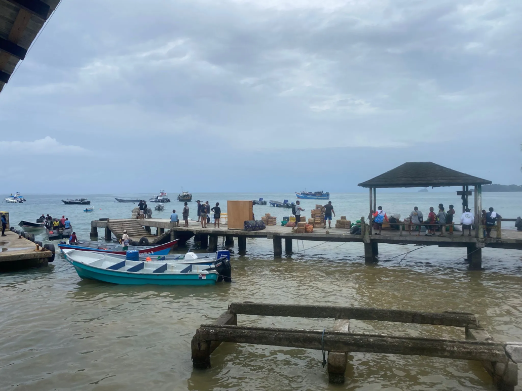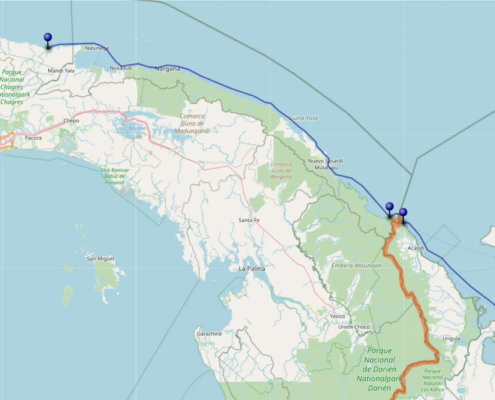 Vier Uhr. Ich bin wach. Noch ist Strom da. Ich drehe eine kurze Runde zur Toilette und probiere ein paar Worte zu sprechen. Klappt, Ich habe Stimme – zumindest ein wenig! Den ganzen gestrigen Abend hatte ich wach gelegen und überlegt, wie ich – ohne meine Stimme – meine Nachhilfestunden handhabe. Die erste, die gleich, nachdem der Strom wieder käme, gestartet hätte, hatte ich schließlich abgesagt und die Entscheidung über die weiteren drei Stunden auf heute vertagt. Doch nun war ich guter Zuversicht! Meine Stimme ist zwar noch etwas kratzig, doch das soll nicht das Problem sein, als ich um zehn meinen Laptop hochfahre. Der Strom war auch pünktlich wiedergekommen, nur das WLAN lässt mich im Stich – was nicht alles schiefgehen kann! Hastig renne ich durch den Regen zu einer benachbarten Lodge und bettle dort um Internet. Die ersten zwei Stunden gebe ich also von dort, bis zur dritten gibt es auch in meinem Hostel dann wieder Verbindung. Nachdem die Einheiten abgehakt sind, schnappe ich mir meinen bereits gestern gepackten Rucksack und laufe zum Hafen von Capurganá. Dort wartet man schon auf mich: „Hattest du nicht gesagt, du kommst um acht?“ „Ja, sorry, aber ich musste heute Vormittag noch arbeiten!“ Doch ich habe Glück – ein weiteres Boot nach Puerto Obaldía ist gerade im Begriff abzufahren. Ich lasse mich schnell noch aus Kolumbien ausstempeln, dann geht es in dem kleinen blauen Plastikkahn in Richtung Panama. Eine Dreiviertelstunde fährt man nach Puerto Obaldía, der ersten richtigen Siedlung hinter der panamaischen Grenze. Nach der Ankunft durchsucht ein Militärkommando lustlos mein Gepäck und schickt mich dann zur Immigration, wo ich meinen Einreisestempel erhalte – Ich bin in Panama! Einen kurzen Moment lang halte ich inne und mache mir klar, welch großes Privileg es war, hier einfach so einreisen zu können: Alles, was mich von den tausenden Menschen unterschied, die unter Todesgefahr durch den Darien-Dschungel irrten, hohe Summen an Schleuser bezahlten und nur davon träumen konnten Panama zu erreichen, war ein kleines rotes Büchlein mit einem goldenen Bundesadler darauf – mein Reisepass! Kaum habe ich das Immigration-Büro verlassen, treffe ich an einem kleinen Restaurant auf Locals, die mir versprechen für morgen ein Boot nach Miramar, einen der ersten an der Küste gelegenen Orte mit Straßenanbindung, denn Puerto Obaldía liegt noch mitten im Darien Gap und besitzt keine Straßenanbindung an das restliche Land. Nachdem alles Wesentliche für die Überfahrt geklärt ist, schlage ich mein Zelt auf einem Stück Gras am Wasser auf und vertreibe mir die restliche Zeit des Tages irgendwie in dem winzigen Dorf.
