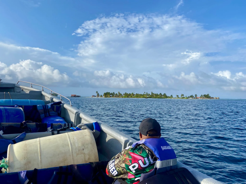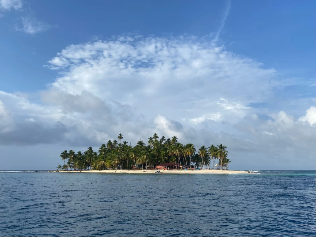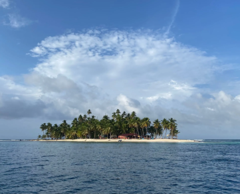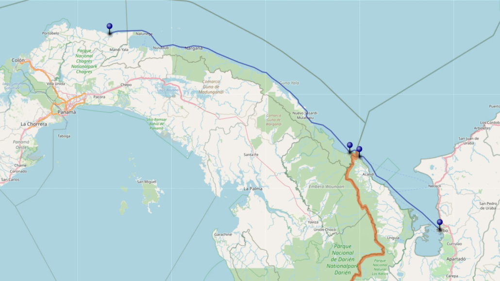 Acht Uhr Abfahrt – so hatten wir es gestern abgemacht. Wie verabredet stehe ich zwei Stunden vorher auf dem Dorfplatz und halte mich dort bereit. Wofür genau, weiß ich nicht so wirklich, denn vor acht passiert gar nichts. Wie sich herausstellt, handelt es sich bei dem Mann, mit dem ich gestern verhandelt hatte, gar nicht um den Skipper, sondern lediglich um einen Fixer – der Skipper und das Boot seien noch gar nicht im Ort. Ungeduldig warte ich auf Neuigkeiten. Mein Schicksal teile ich mir mit einem jungen Kolumbianer, der ebenfalls auf dem Weg durch den Darien Gap ist. Es ist halb zehn, als sich endlich etwas bewegen zu scheint. Wir schultern unsere Rucksäcke und laufen zu dem neben der Militärbasis gelegenen Steg. Hier wird unser Gepäck durchsucht und wir treffen auf einen älteren Russen, der ebenfalls auf das Boot wartet. Das Boot sei auf dem Weg und müsste jeden Moment kommen, verspricht uns der Fixer und verschwindet dann wieder im Dorf – doch das Boot kommt nicht! Stunde um Stunde warten wir in der heißen Mittagssonne. Jedes Mal, wenn das Geräusch eines Zweitakters in der Ferne auftaucht, hoffe ich, dass nun endlich unser Boot kommt, aber auch gegen Mittag fehlt jede Spur des Bootes. Inzwischen herrscht Unsicherheit darüber, ob wir heute überhaupt noch abfahren würden – immerhin lagen noch sechs Stunden Fahrt vor uns. Gegen zwölf kommt dann die Nachricht: Das Boot sei in fünf Minuten da! Aus fünf Minuten werden zwanzig, dann taucht das Boot tatsächlich am Horizont auf. Ohne weitere Zeit zu verlieren, hieven wir unser Gepäck in das Speedboot und machen uns auf den Weg. Von zwei 300 PS Motoren angetrieben fliegen wir förmlich über die Wellen und klatschen hinter jedem Wellenberg hart aufs Wasser. Die Sonne grillt mich ohne Gnade. Immerhin die Aussicht kann sich sehen lassen: Wir fahren mitten durchs Paradies! Türkisblaues Wasser, unzählige kleine Inseln mit weißen Sandstränden und Kokospalmen. Hin und wieder kleine Siedlungen der Guna Yala, einer indigenen Bevölkerungsgruppe, die hier auf dem San Blas Archipel heimisch ist. Immer neue Inseln tauchen auf, eine traumhafter als die andere. Oh, wie schön ist Panama! Punktgenau zum Sonnenuntergang erreichen wir nach sechs Stunden Fahrt den kleinen Miramar, eine der ersten Ortschaften an der Küste mit Straßenanbindung. Zurück in der Zivilisation! Auf den kleinen Dorfplatz finde ich ein Restaurant, in dem ich mir eine große Portion Kochbananen mit Hähnchen bestelle, und schlage anschließend mein Zelt am Strand auf.