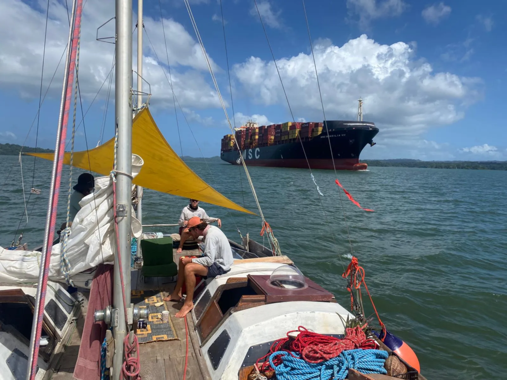 Gemeinsam laufen wir von unserem Camp am späten Morgen in die Marina. Es dauert nicht lange, bis wir dort Aufsehen erregen – dem Security-Guard gefiel es gar nicht, dass die Gruppe junger, in der Marina herumlungernder Männer inzwischen auf fünf Leute angewachsen war. Erstmal gibt es jedoch nur eine Ansage, dass wir uns weniger auffällig verhalten müssten, damit der Manager uns nicht rausschmeiße. Bereits gestern hatte der Security bemängelt, dass ich meinen großen Rucksack mitschleppe – Backpacker seien von der Marina nicht besonders gern gesehen. Naja, ich widme erstmal zwei Nachhilfestunden, die nun anstehen. Gegen Ende der ersten Stunde kommt Cedric mit einem Zettel zu mir, auf dem steht, dass man uns nun der Marina verwiesen habe. Er und Marcel würden sich eine andere Marina suchen, um ein Boot nach Kolumbien zu finden (sie sollen schon wenige Tage später Erfolg haben). Jules, Lukas und ich dürften noch hierbleiben, bis wir heute Mittag von Hans abgeholt würden. Pünktlich um 13 Uhr kommt Hans in einem winzigen Ruderboot an Land gepaddelt und bringt uns – einem nach dem anderen – auf das Segelboot. Gehören tut der rustikale Katamaran gar nicht ihm, sondern Anouska, einer jungen englischsprachigen Frau. Zu fünf sitzen wir noch einige Zeit in der Sonne auf dem hölzernen Deck und machen uns einige Sandwiches zum Mittagessen, dann fahren wir zu einer Markierungstonne, an welcher wir auf das Lotsenboot warten sollen. Deutlich nach der vereinbarten Zeit, taucht jenes am Horizont auf und der Lotse steigt zu uns über. Langsam tuckern wir, den kleinen Motor auf Maximalgeschwindigkeit gedreht, durch die Bucht und schließlich unter der „Puente Atlántico“ hindurch in den Kanal rein. Wenig später taucht das erste Schleusenpaar vor uns auf. Unser Lotse deutet auf einen schmalen Seitenkanal, der am rechten Ufer ins Inland führt „Das sind die Überreste des französischen Kanals!“. 1880 begannen die Franzosen einen Kanal durch Panama zu graben. Der Plan: Pazifik und Atlantik mit einem schleusenlosen Kanal auf Meereshöhe verbinden. Doch bei den Bauarbeiten raffen tropische Krankheiten in kürzester Zeit zehntausende Arbeiter hin – das Projekt wird eingestellt. Zwanzig Jahre später kaufen die USA die gescheiterten Überreste des Projekts. Statt einem Kanal auf Höhe des Meeresspiegels wollen sie den „Rio Chargres“, einen großen Fluss, zu einem Stausee aufstauen und die Schiffe mit Schleusen auf dessen Niveau heben – so würden sie sich einen wesentlichen Teil des eigentlichen Kanals sparen können. Nach genau zehn Jahren Bauzeit wird das monumentale Jahrhundertbauwerk schließlich eingeweiht und erspart seither tausenden Schiffen den gefährlichen und langen Weg um das Kap Horn. Vor der ersten Schleuse vertäuen wir unseren Katamaran mit einem anderen Segelboot, in der Schleusenkammer wird das „Paket“ aus unseren Booten dann mit Leinen in der Mitte gehalten. Es folgen zwei weitere Schleusenkammern mit demselben Prozedere, dann befinden wir uns 36 Meter über dem Meeresspiegel im „Gatún-See“. An einer Ankerboje machen wir dort fest, der Lotse geht von Bord – morgen früh geht es weiter!