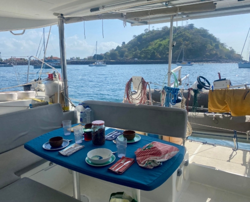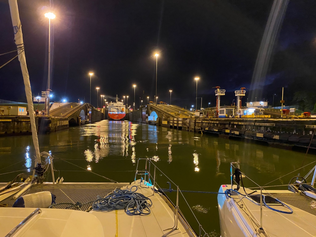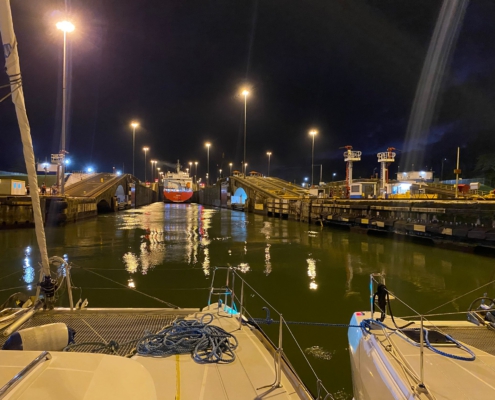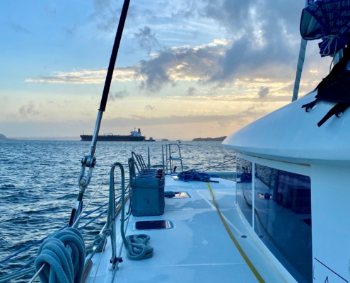Unser Frühstückstisch kann sich sehen lassen: Selbstgemachter Joghurt mit selbstgemachtem Granola-Müsli, frisches Rührei, hauseigene – besser gesagt bootseigene – Fruchtmarmeladen und frisch gebackenes Brot – daran könnte ich mich gewöhnen! Nach dem Frühstück verschanze ich mich in meiner Kabine und gebe vier Nachhilfestunden – für den Panama-Kanal waren wir so oder so erst um 15 Uhr terminiert. Eine Stunde vor der uns gegebenen Traverse-Zeit, haben wir immer noch keine Bestätigung der Kanalverwaltung bekommen – normalerweise bestätigte diese am Vormittag noch einmal die vergebenen Timeslots. Wir nutzen die Wartezeit, um die Solarpaneele des Katamarans in Styropor-Platten einzukleiden – so wollten wir diese vor dem Affenfäusten, Knoten mit einem kleinen Stahlgewicht darin, schützen, die von den Linehandler in den Schleusen auf unser Boot warfen. Auch um 15 Uhr gibt es keine Neuigkeiten von der Kanalverwaltung, kein Lotsenboot ist in Sicht. Der Agent, mit welchem Paulo und Dilma die Kanalpassage organisiert hatten, schreibt uns derweil, dass es vermutlich erst gegen 16:30 Uhr losginge. Wir warten also weiter und fallen so lange über den Kuchen her, den Dilma gebacken hatte. Es ist kurz nach fünf als endlich ein Lotsenboot am Horizont auftaucht, geradewegs auf uns zusteuert und uns unseren Lotsen bringt. Mit tuckerndem Motor geht es durch die Bucht, unter der „Puente Atlántico“ hindurch in Richtung des ersten Schleusensets. Unmittelbar vor der Schleuse vertäuen wir unseren Katamaran mit einem weiteren Katamaran auf der Steuerbord- und einem kleineren Segelboot auf der Backbord-Seite. Dadurch das wir nun in der Mitte waren hält sich die Arbeit in der Schleuse für uns in sehr überschaubaren Grenzen – die Leinen, mit denen das „Paket“ aus den drei Booten in der Mitte der Schleusenkammer gehalten wurde, gingen nämlich immer zu den jeweils äußeren Booten. Einzig und allein Paulo als Skipper muss schwitzen – er war es, der nun die Verantwortung hatte, das gesamte Bootsbündel und nicht nur seinen eigenen Katamaran sicher durch die Schleusen zu manövrieren. Gegen halb neun machen wir schließlich an einer der Ankerbojen im Gatún-See fest, essen einen typisch portugiesischen Bacalhau-Auflauf, den Dilma gezaubert hatte und fallen schließlich müde ins Bett.