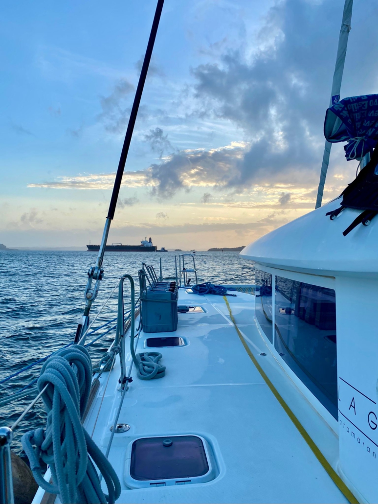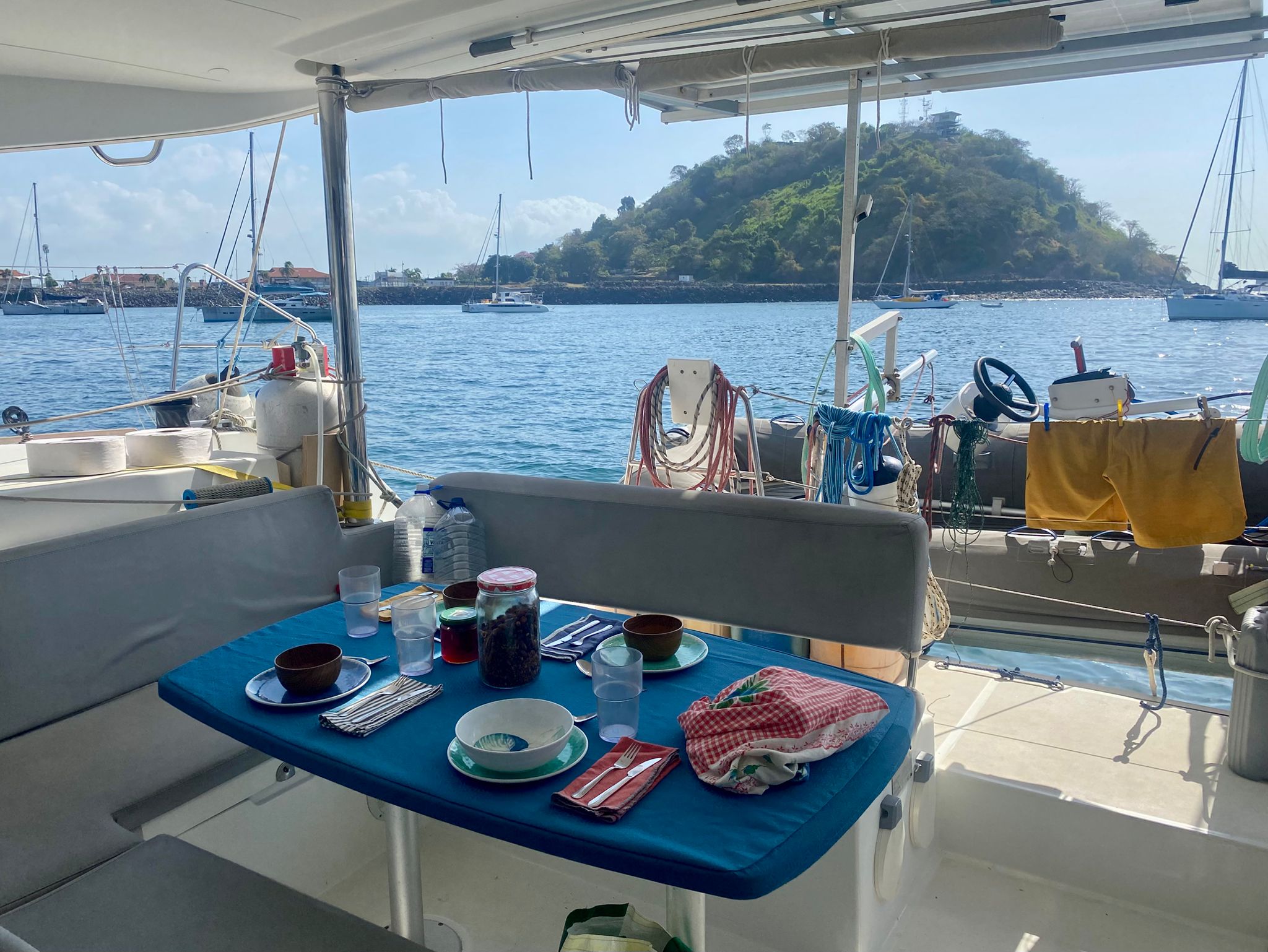 Paulo werkelt am Auspuff des Generators, Dilma backt ein frisches Brot, Alvaro liest ein Buch und ich nutze den Vormittag, um bei meinen Eltern anzurufen, zeige ihnen das Boot und seine Crew. Gerade als wir zum Ende des Anrufs kommen, klingelt bei ihnen im Hintergrund das Telefon – Oma ruft an! Kurzerhand schalten wir also meine Großmutter zu unserem FaceTime-Call dazu und telefonieren noch ein wenig gemeinsam weiter. Nach dem Mittagessen kehrt auf dem Katamaran Ruhe ein. Gelangweilt vergehe ich mich an dem ersten meiner heruntergeladenen Bücher – eigentlich hatte ich damit bis zur Abfahrt warten wollen – und tauche in die Abenteuer des kleinen Hobbits Bilbo Beutlin ab.