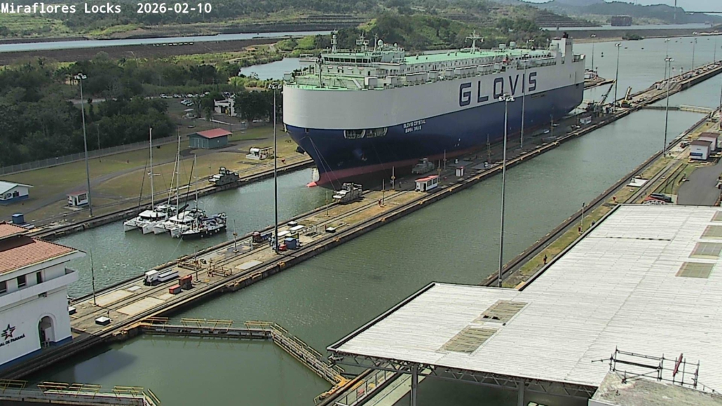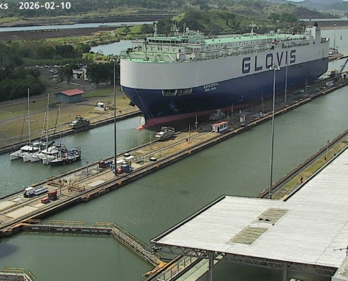 Pünktlich um kurz nach acht, kommt unser Lotse wieder an Bord und wir können unsere Fahrt fortsetzen. Mit zügigen sieben Knoten (13 km/h) fahren wir durch die mit dichtem Dschungel bewachsene Insellandschaft des Stausees und schließlich in den zweiten Teil des Kanals. Sich auf einem der das Kanalufer befestigenden Felsen sonnend, entdecken wir hin und wieder das eine oder andere Krokodil. Plötzlich kommt Dilma zu mir und bittet mich in den Saloon „Felix, ich muss kurz mit dir reden!“ Ich befürchte schon das Schlimmste – hatte ich irgendetwas falsch gemacht?! – doch Dilma hat nur gute Neuigkeiten für mich: „Wenn du magst, darfst du nach der Kanaldurchfahrt auf dem Boot bleiben. My house, is your house!“ Ursprünglich hatte man mir gesagt, dass man mich – da man mich ja bisher kaum kannte – nicht allein auf dem Boot lassen wolle und ich daher erst wenige Tage vor Abfahrt final auf den Katamaran ziehen könne. Doch nach zwei gemeinsamen Tagen brachte Dilma es nicht mehr übers Herz, mich zurück in ein Hostel zu schicken. Um die Mittagszeit herum erreichen wir die nächste Schleuse und essen – nachdem wir sicher vertäut sind – zu Mittag, während hinter uns ein riesiges blau-weißes Containerschiff einparkt. Zum Dessert hat Dilma feinstes Mousse Chocolat gemacht – ein Gaumenschmaus! Eine halbe Stunde später folgen die letzten beiden Schleusenkammern, dann befinden wir uns wieder auf Meeresniveau und es ist nur noch eine Frage der Zeit bis wir unter der „Puente de las Américas“ in den Pazifik fahren. Mit unseren zwei leistungsstarken Motoren geht das dieses Mal deutlich schneller als mit dem winzigen Außenborder auf meiner letzten Fahrt durch Panamakanal und so erreichen wir bereits um kurz vor vier unseren Ankerplatz, neben der „La Playita“-Marina.