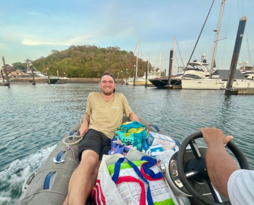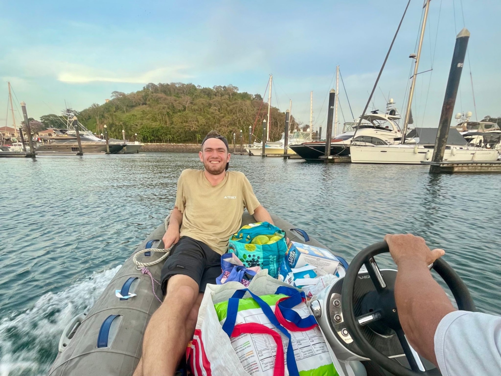 Am Morgen gebe ich eine vereinzelte Mathestunde, anschließend quetschen wir uns dann zu fünft ins Dinghy und fahren an Land. Victoria und Luan, die brasilianischen Freunde von Paulo und Dilma, verließen uns heute wieder. Während sie sich auf den Weg zu ihrem Hotel machen, brechen wir zu unserem ersten Shopping-Ausflug auf – es würden noch viele weitere folgen. DiscoveryCenter heißt der Laden, an dem unser Uber-Fahrer uns abliefert. Victoria hatte ihn empfohlen und gesagt, dass es hier wirklich alles gäbe – und damit hatte sie nicht übertrieben. In den hohen Lagerhausregalen sind Produkte aller Art verteilt: Lebensmittel, Motorenöl, Haushaltsprodukte, Kleidung, Kinderspielzeug, Camping- und Gartenbedarf, Angelequipment, Fahrräder, Schreibwaren und so vieles mehr. Doch obwohl wir anderthalb Stunden in dem Geschäft verbringen und einiges kaufen – wirklich etwas von der Einkaufsliste, die Dilma geschrieben hatte, streichen können wir nicht. Gegen Mittag fahren wir zu einem Sushi-Restaurant – Dilma sprach schon seit unserem ersten Treffen davon, endlich Sushi essen zu wollen – und treffen uns dort wieder mit Victoria und Luan. Des Weiteren kam unser viertes Crew-Mitglied, Alvaro, ein 23-jähriger Portugiese, zum Essen hinzu. Der Sushi-Restaurant allerdings geschlossen und so müssen wir uns mit dem gegenüberliegenden Restaurant zufriedengeben. Nach dem Essen setzen wir unseren Einkaufstrip fort und räumen bei PriceSmart, einer Bulk-Store-Kette, die Regale leer: Dutzende Kilo Mehl, Reis und Zucker, literweise Olivenöl und Essig, ein halber Einkaufswagen voll Tunfisch-Dosen. Paulo und Dilma kauften nicht nur für die Überfahrt, sondern vor allem auch für ihre anschließende Zeit in Französisch-Polynesien ein, denn viele Produkte wären auf den abgelegenen Südseeinseln nur schwer – und wenn, dann teuer – zu bekommen. In einem bis unters Dach gefüllten Uber machen wir uns auf den Rückweg zur Marina und transportieren von dort, in mehreren Fahrten, die Einkäufe mit dem Dinghy aufs Boot.
