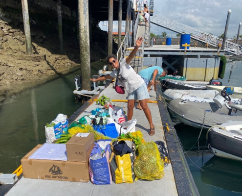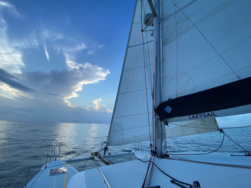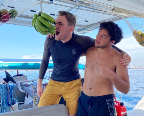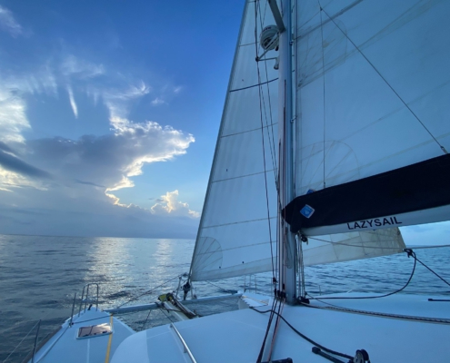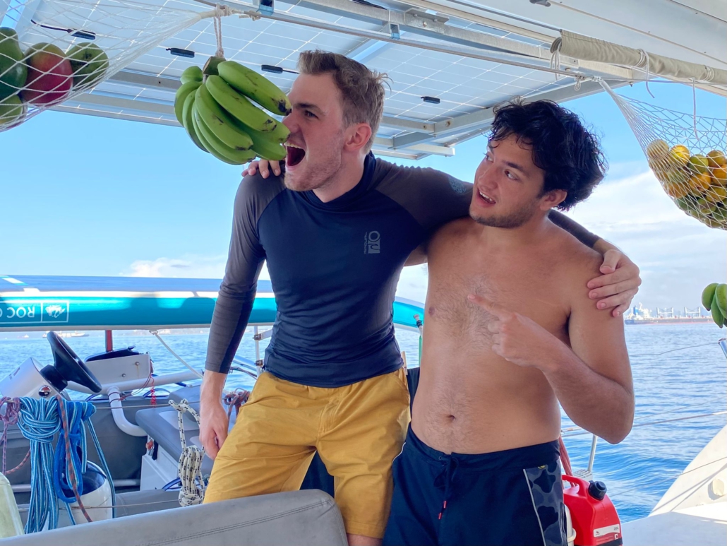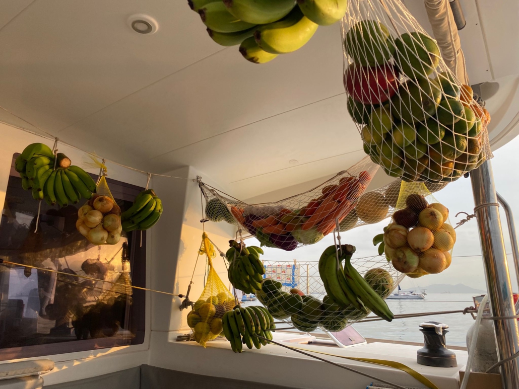 Es ist noch dunkel, als wir mit dem Dinghy über das im Mondlicht schimmernde Wasser gleitend in die Marina fahren. Fast eine Dreiviertelstunde sitzen wir anschließend im Auto, bis wir den etwas außerhalb von Panama City gelegenen „Merca Panama“, einen für den Großhandel gedachten Obst- und Gemüsemarkt erreichen. Der Markt ist so aufgebaut, dass man mit dem Auto zwischen den Ständen hindurchfahren kann. In einer Straße gibt es Wassermelonen, in der nächsten Ananas, in der übernächsten reihen sich Bananenstände aneinander. Im großen Stil kaufen wir hier ein: Eine ganze Bananenstaude, säckeweise Melonen, Kürbisse, Mangos, Ananas, Orangen, Mandarinen, Tomaten, Zwiebeln & Möhren. Uns ist bewusst, dass ein Großteil des Obsts nach spätestens zwei Wochen zu gammeln beginnen würde, doch zumindest in den ersten zwei Wochen könnten wir so reichlich Vitamine zu uns nehmen. Auf dem Rückweg in die Marina halten wir noch bei der Kurierfirma, die Paulo und Dilmas Amazon-Pakete nach Panama importiert hatte. Leider ist unser Auto jedoch bereits bis zum Rand mit Früchten gefüllt, dass wir für die Pakete einen zusätzlichen Uber bestellen müssen. Mit dem Dinghy bringen wir am späten Vormittag alles auf das Boot, dann muss Paulo das Auto abgeben. Den Nachmittag verbringen wir damit, das gesamte Obst in Netzen und an Seilen im Cockpit aufzuhängen – dieses erinnert bald mehr an einen tropischen Garten als an ein Segelboot. Am späten Nachmittag wollen wir uns schon einmal ausstempeln, damit wir morgen früher loskönnten, doch im Büro der Migrationsbehörde erklärt man uns, dass wir zum Ausklarieren ein Dokument von der Hafenbehörde bräuchten – und die hatte vor einer Viertelstunde dichtgemacht. Beim Abendessen teilen wir schließlich die Nachtschichten ein: Jeweils zwei Drei-Stunden-Schichten muss jeder von uns übernehmen, dazwischen hat man dann jeweils neun Stunden frei. Ich wäre jeweils von 3-6 Uhr und am Nachmittag von 15-18 Uhr „on Duty“ – das kommt mir gelegen, denn so habe ich den Vormittag über frei und kann Nachhilfestunden geben.