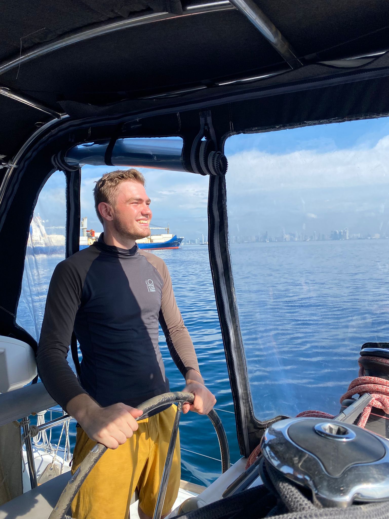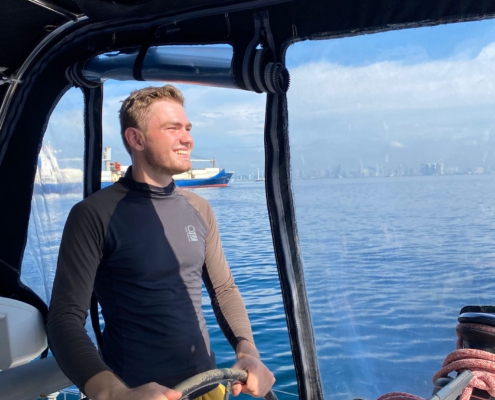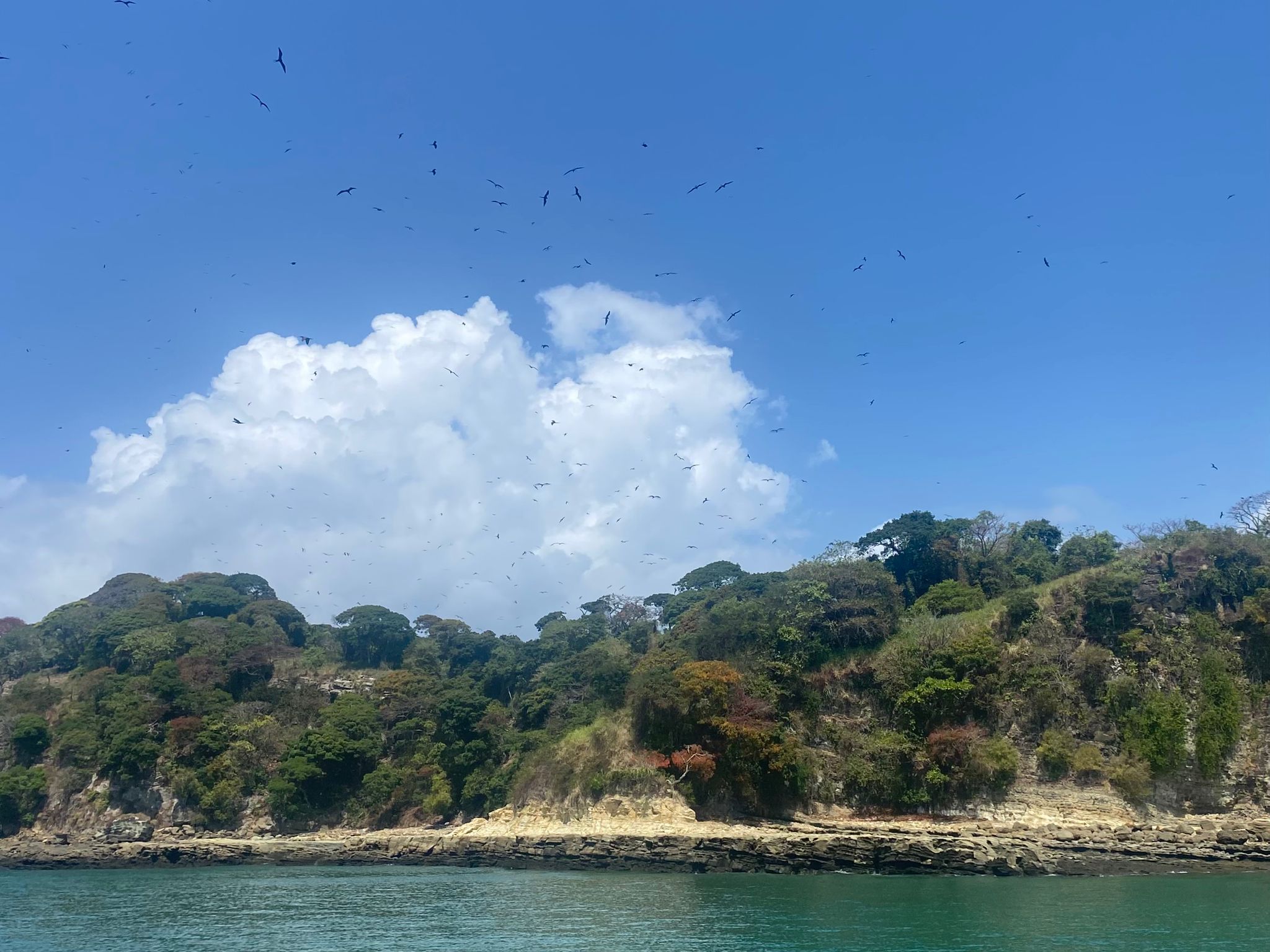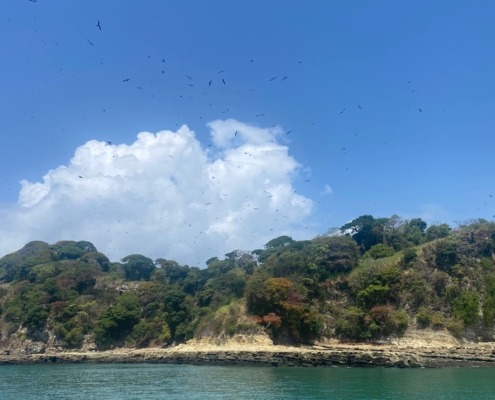 Um Punkt sieben Uhr stehen wir vor dem Büro der Hafenbehörde von Panama City, welche uns ein zum Ausklarieren notwendiges Dokument ausstellen soll. Doch die Frau, die in dem kleinen Büro sitzt und sichtlich genervt ist bei ihrem Frühstück gestört zu werden, weist uns ab: Ihr Chef sei dafür zuständig, der sei aber noch nicht im Büro. Ungeduldig warten wir eine halbe Stunde bis der Mann schließlich auftaucht, nur um uns einen Stapel mit Dokumenten zu geben, die es auszufüllen gilt. Nachdem wir dann endlich das Papier bekommen haben, können wir uns aus Panama austempeln lassen und machen uns auf den Rückweg zum Boot. Zwanzig Minuten später tuckert der Motor los, wir heben unseren Anker und fahren dem blauen Horizont entgegen. Wind war – wie zu erwarten – kaum vorhanden und so bleibt es dem Motor überlassen uns heute nach „Las Perlas“ zu bringen. Langsam verschwinden die Glasfassaden der Wolkenkratzer von Panama City hinter uns in der Ferne. Wenig später ist das Land in alle Richtungen komplett verschwunden – allein fühlt man sich trotzdem nicht, denn vor Panama City herrscht natürlich reger Containerschiff-Verkehr. Nach fünf Stunden Fahrt tauchen am Horizont schließlich die Umrisse einiger Inseln auf, Delfine schwimmen unweit unseres Bootes durch das tiefblaue Wasser. Wir ankern neben einem kleinen weißen Sandstrand. Abgesehen von diesem sieht die felsige Insel, die mit dichtem Dschungel bewuchert ist und über die hunderten großen Vögel kreisen, aus, als wären wir unmittelbar in „Jurassic Park“ gelandet. Den verbleibenden Nachmittag über ruhen wir uns alle ein wenig aus. Ich nutze die Zeit zudem, um noch schnell meinen nächsten Blogpost fertigzuschreiben, damit dieser morgen pünktlich online gehen könnte, als mich plötzlich ein Geräusch aus meinem Flow reißt – Waren das … Wale?! Ich schnappe mir ein Fernglas und suche das Wasser ab – und tatsächlich: In einiger Entfernung sehe ich die Blasfontäne und die Rückenflossen einer Walfamilie. Kurz ist die Freude groß, doch schon bald gewöhnen wir uns an Gepruste im Hintergrund und gehen wieder unseren Tätigkeiten nach.