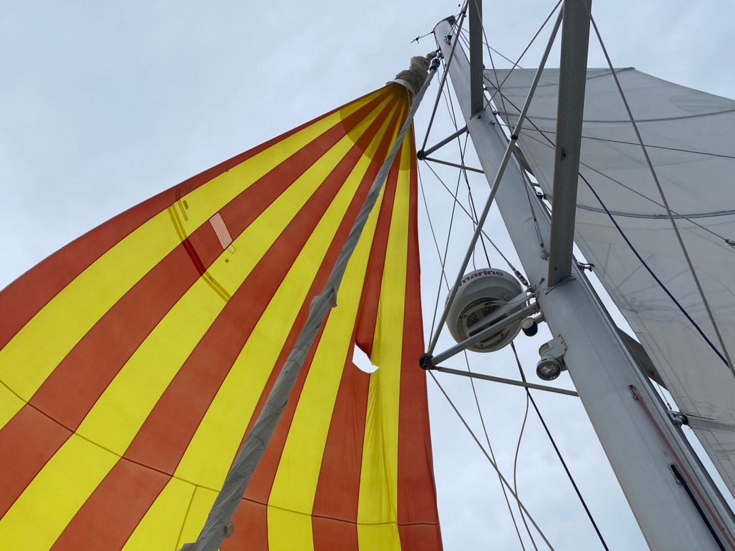 Nach zwei fischlosen Tagen surrt am Vormittag das Reel der Angel wieder – und wie! Da muss ein richtiger Brocken dranhängen. In einem langen Kampf gelingt es Paulo, das, was sich da in den Haken verbissen hat, näher ans Boot zu ziehen. Wenig später zeichnen sich durch die Wasseroberfläche die Konturen eines großen Thunfischs ab. Mit vereinten Kräften von Angel, einem Haken und einem Kescher, der dabei seinen Geist aufgibt, gelingt es uns das schwere Tier an Deck zu bekommen. Auf der einen Seite freue ich mich über unseren Angelerfolg und genieße das Privileg so frischen Fisch essen zu dürfen, auf der anderen Seite betrachtete ich den eleganten silber-glänzenden, nun leblos und blutverschmiert auf einem Schneidebrett liegenden Fischkörper aber auch mit Wehmut – was für ein schönes Wesen! Der Thunfisch hat ordentlich was auf den Rippen … ähh, Gräten und soll für vier leckere Mahlzeiten reichen. Nachdem es zum Mittag Sushi gab, räumen wir den Tisch frei und kümmern uns um unseren Spinnaker, in dem immer noch ein großes Loch klafft. Anders als der Spinnaker damals auf der SeaEsta handelt es sich bei unserem Spinnaker nicht um einen Furling-Spinnaker, bei dem das Segel aufgerollt wird, sondern um ein Spinnaker mit Bergeschlauch, bei dem eine lange, sockenartige Hülle von oben über das Segel gezogen wird, um dieses einzuholen – das macht es unweigerlich leichter an die zu flickende Stelle zu gelangen. Gerade einmal zwanzig Minuten brauchen wir, dann ist das Segel wieder einsatzbereit.