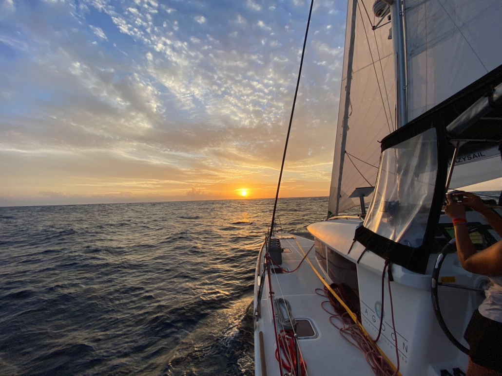 Der Sonntag verläuft ruhig. Keine Nachhilfestunden, konstanter Wind, wenig Wellengang, blauer Himmel – traumhafte Bedingungen! Gegen Mittag reißt dann unerwartet eine Naht unseres Gennakers auf. Wir hatten das Segel die ganze Zeit relativ nah am Limit dessen benutzt, was als minimaler Winkel zum Wind möglich war – scheinbar zu sehr am Limit. Die Genoa löst den Gennaker also ab und wir beschäftigen uns mit dem Flicken des Segels. Diesmal reicht es allerdings nicht ein wenig selbstklebendes Reparaturtape aufzubringen – es muss genäht werden! Da Paulo Dilma, die gerade Mittagsschlaf macht, nicht wecken möchte, versucht er sich selbst an der Nähmaschine. Nach einigen Probeläufen mit Teststücken scheint er den Dreh rauszuhaben und es gelingt uns tatsächlich ohne die Hilfe der Fachfrau, das Segel wieder in Ordnung zu bringen. Die Genoa leistet allerdings gute Dienste – noch immer machen wir konstante 6,5 Knoten – und so wird der Gennaker erst einmal weggepackt. Am Abend färbt ein weiterer traumhafter Sonnenuntergang den Horizont in leuchtende Farben.