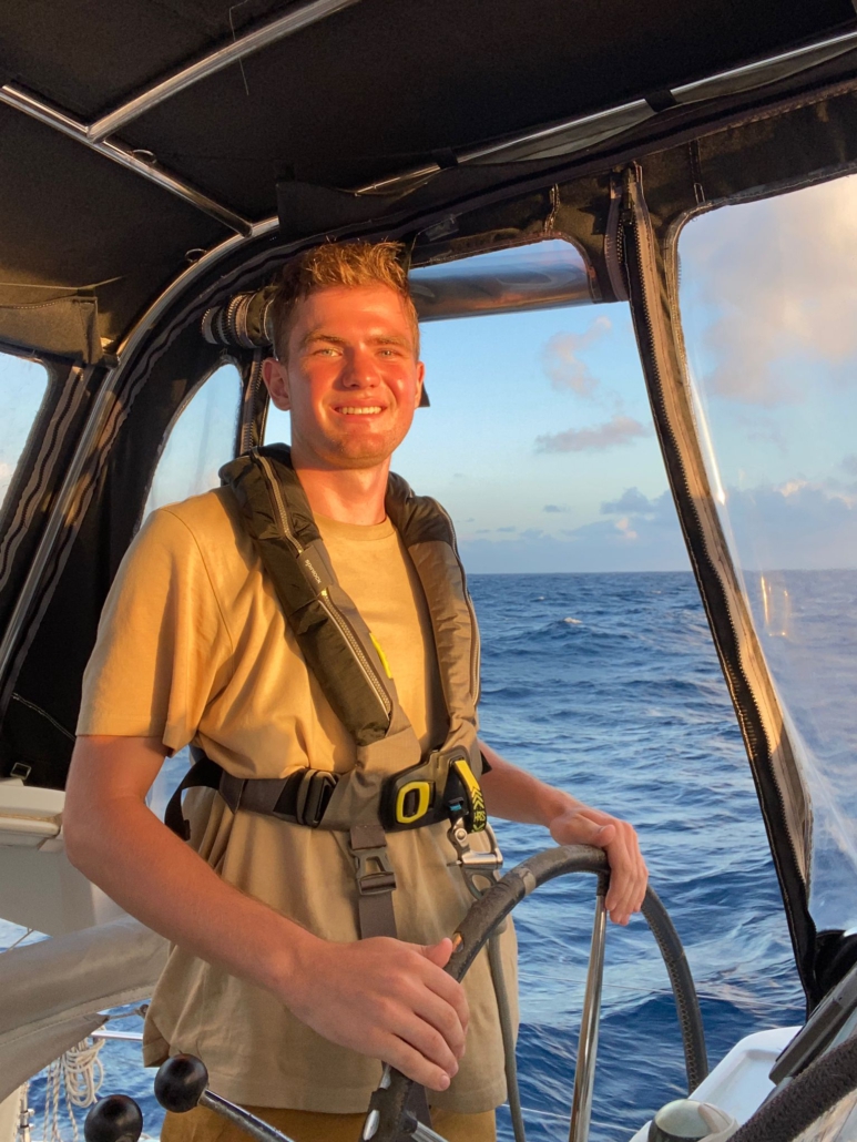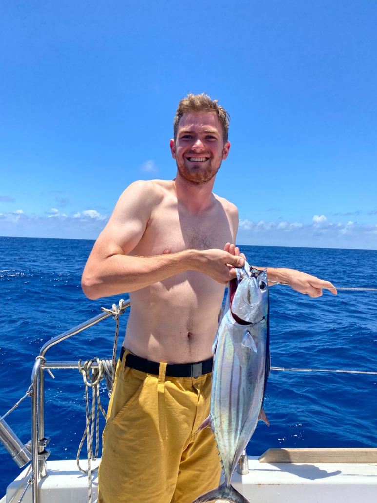 Die drei Nachhilfestunden, die ich am heutigen Morgen gebe, sind ein kompletter Kontrast zu den gestrigen. Obwohl der Wind uns weiterhin zügig übers Wasser pustet, hat der Wellengang nachgelassen. Infolgedessen kann ich – ohne mich irgendwo festkrallen zu müssen – aufrecht sitzen, das Internet funktioniert zuverlässig und, da es bewölkt ist, bleibt auch die Temperatur in meiner Kabine im angenehmen Bereich. So darf es bleiben! Kurz nachdem ich wieder an Deck bin, hängt zudem ein Fisch am Haken – zum Mittag gibt es dann wohl Mahi-Mahi-Filets! Im Laufe des Tages lässt der Wind nach und trifft nun nicht mehr schräg von der Seite, sondern genau von hinten auf unser Boot. Im ersten Moment würde man denken, Rückenwind ist gut, doch direkter Rückenwind ist tatsächlich nicht optimal – gerade für einen Katamaran! Bei diesem ist der Winkel, in dem sich das Großsegel verstellen lässt, nämlich deutlich kleiner als bei einem klassischen Segelboot. Wir wechseln auf unseren Spinnaker. Das hauchdünne, rot-gelbe Vorsegel erweist sich nicht als sonderlich stabil: Immer wieder gerät es in den Windschatten des Hauptsegels und fällt dann in sich zusammen. Einige Zeit lang geht das gut, doch dann passiert, was passieren muss: Das Segel kollabiert, bleibt an einem der Querträger des Mastes hängen und reißt. Paulo lässt sich davon nicht aus der Ruhe bringen – ich glaube generell kann nichts diesen Mann aus der Ruhe bringen –, wir holen den Spinnaker wieder ein und setzen stattdessen den stabileren Gennaker, der im Kompromiss jedoch einen südlicheren Kurs erfordert – um das Flicken kümmern wir uns wann anders! Während Paulo, Alvaro und ich mit dem Wechseln der Segel beschäftigt sind tobt Dilma sich in der Küche aus: Es gibt köstliches Nutella-gefülltes Brioche und zum Abendessen später Tacos. Gerade als meine Nachmittagsschicht sich dem Ende neigt kündigt das sich abrollende Reel der Angel den nächsten Fisch an – diesmal ein Thunfisch. Jedoch ist der silber-bläulich schimmernde Fisch recht klein – davon wird man nicht satt – und so entlassen wir ihn – vermutlich höchst traumatisiert von den Aliens, die ihn entführt haben – zurück in die Freiheit. Keine fünf Minuten später hängt ersatzweise ein weiterer Mahi-Mahi am Haken.