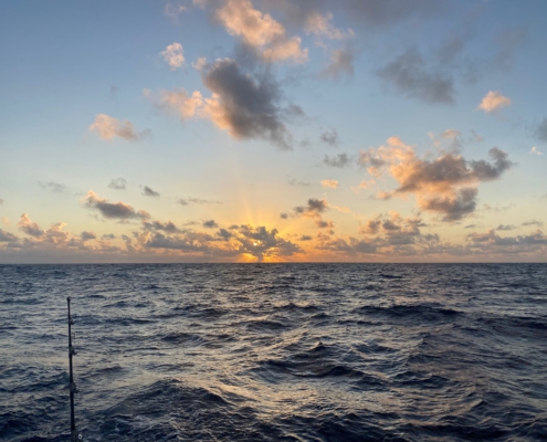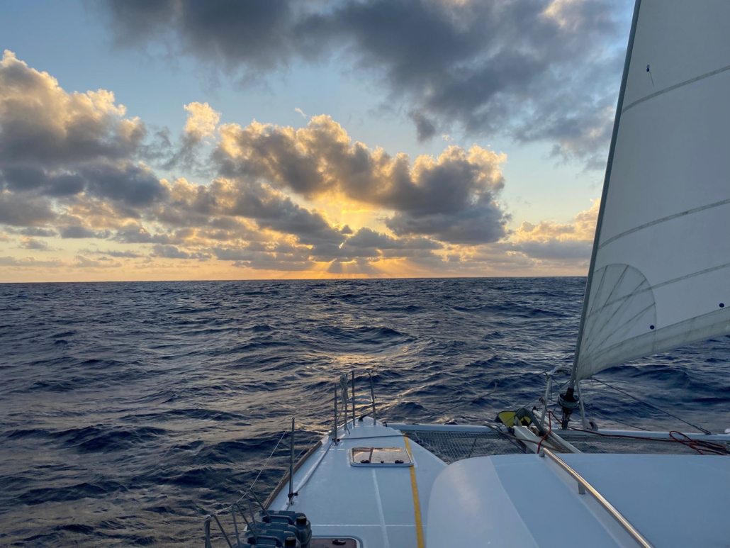 Der Wind und vor allem der Wellengang hatten nachgelassen – Zeit, dass unser Spinnaker wieder zum Einsatz kommt. Das riesige rot-gelbe Segel bringt uns einen konstanten, wenn auch etwas langsameren Vortrieb ein. Der restliche Tag verläuft ruhig. Frische Bettwäsche und eine Süßwasserdusche hauchen mir ein komplett neues Lebensgefühl ein – die Schicht aus Salz, Schweiß und Sonnencreme zumindest für ein paar Stunden Vergangenheit. Zum Mittag wie zum Abendessen gibt es Thunfisch-Gerichte – wie vielfältig die Möglichkeiten doch sind ein und denselben Fisch zu kochen!