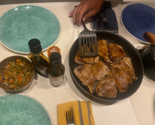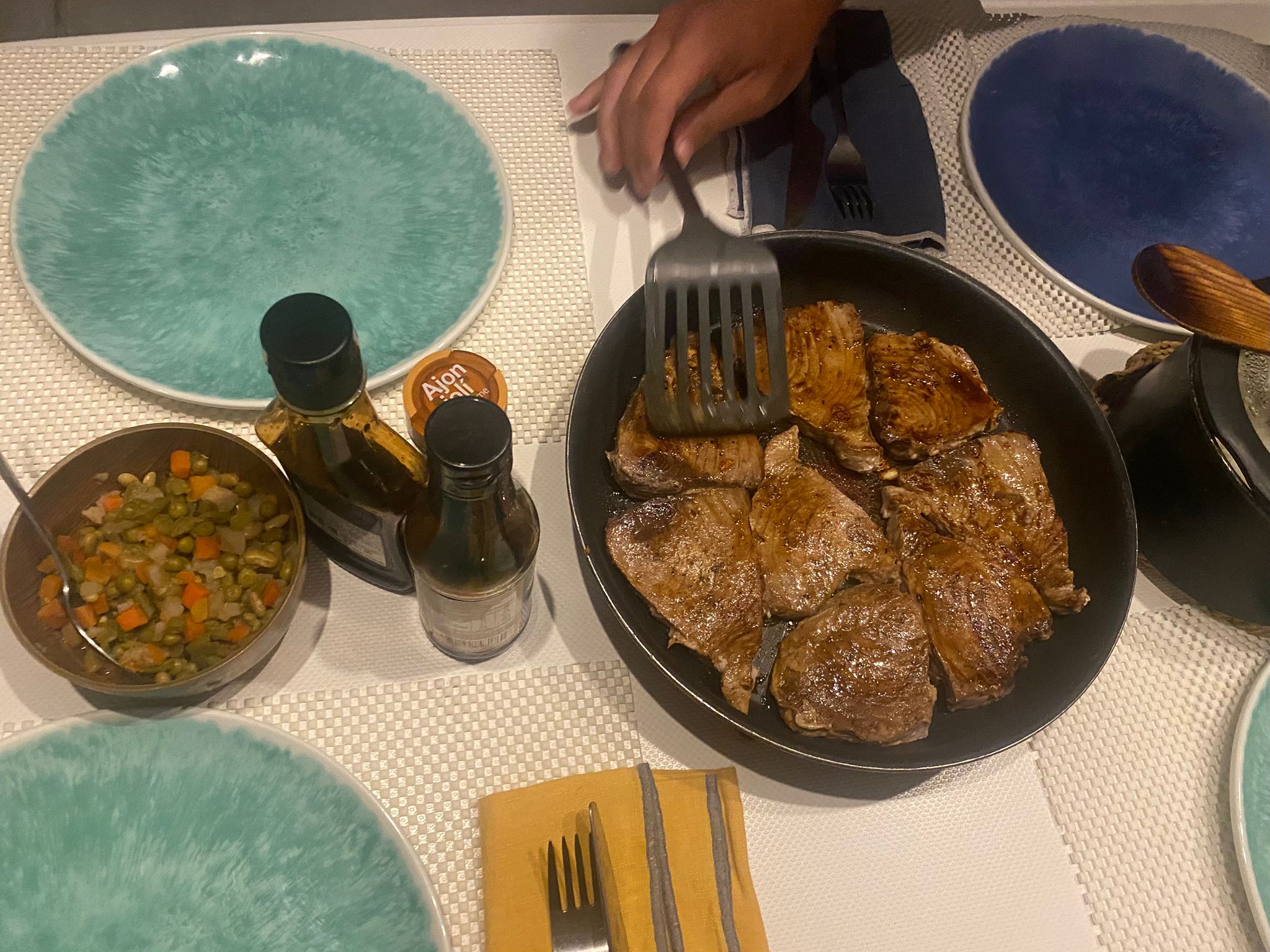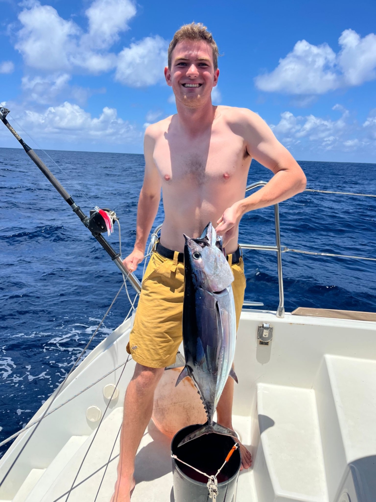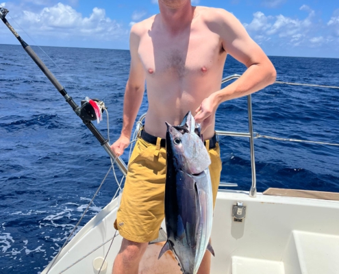 Ich komme gerade von zwei Nachhilfestunden wieder an Deck, als das Reel der Angel zu surren beginnt. Paulo beginnt zu kurbeln – ein wenig Widerstand, aber keine Bewegung! Es schien, als hätten wir ein Treibgut am Haken. Paulo kurbelt weiter, bis schließlich irgendwann das Ende der Angelschnur in Sicht kommt – da hängt ein Fisch dran, aber der bewegt sich nicht! Erst als der große Thunfisch wenige Meter vor unserem Boot ist, scheint er plötzlich aufzuwachen und beginnt mit all seiner Kraft gegen die Angel anzukämpfen. Doch er hat keine Chance mehr! Mit vereinten Kräften hieven wir ihn an Bord und beginnen wenig später mit dem Ausnehmen – zehn Tage lang sollen wir täglich von dem Fleisch essen können. Am Nachmittag stellen wir zum dritten Mal in den vergangenen Wochen die Uhr eine Stunde vor – inzwischen war es bei uns neun Stunden früher als in Deutschland. Zum Abendessen gibt es leckere Thunfisch-Steaks, bevor sich der nächste Tag dem Ende neigt.