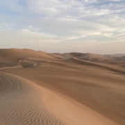 Mit einem Dünenbuggy fahren wir in die Wüste hinein und stoppen schließlich oben auf einer der Dünen. Ich ziehe mir meine Skistiefel an, wachse die Skier, dann geht es runter!